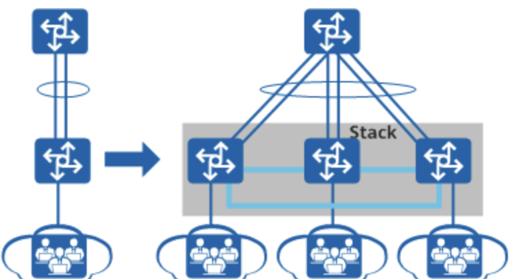 如下图所示,网络中的多台设备组成堆叠,虚拟成单一的逻辑设备。