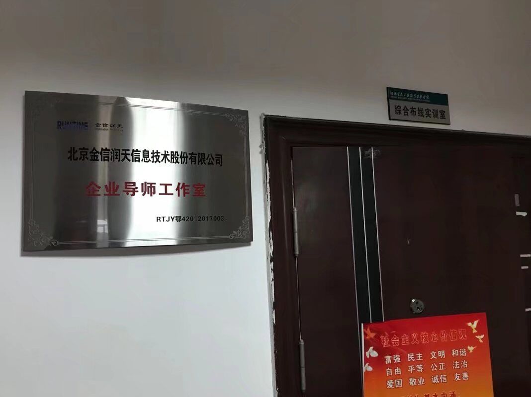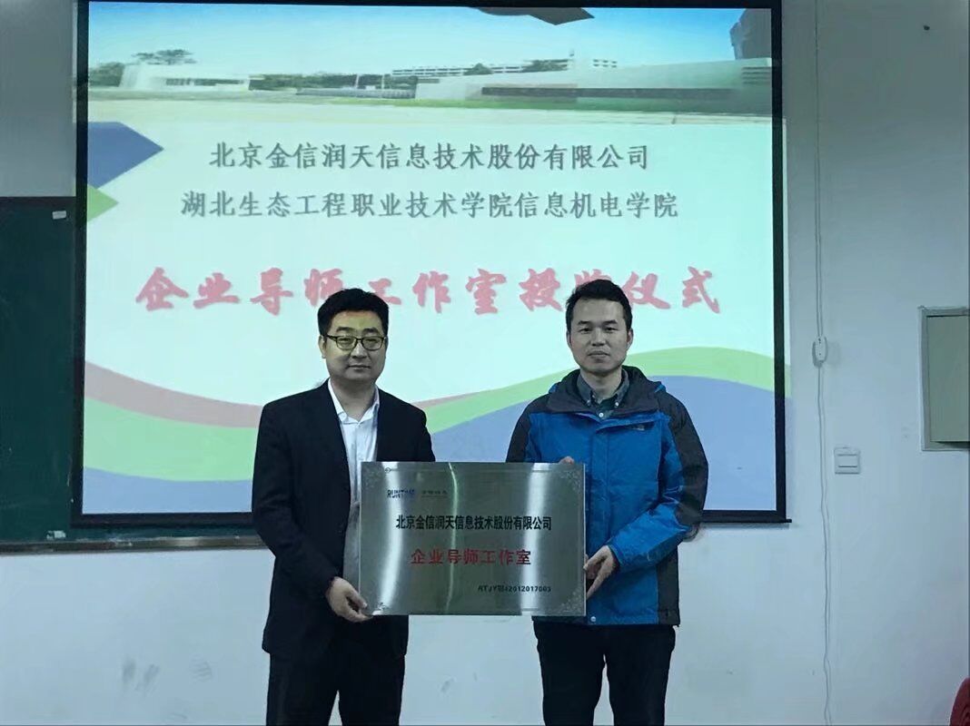 北京金信润天信息技术股份有限公司湖北第三间企业导师工作室于2017年10月23日下午在湖北生态职业技术学院信息机电学院大型会议室举行校企双方正式授牌仪式,该校信息机电学院杨旭院长、刘振明副院长、陈刘洋老师、金信润天校企合作部部长姜明哲、华中区总监平原等老师及公司同事一同出席本次签约仪式。 以真实项目为驱动,一线工程师传帮带,推广现代学徒制试点模式!