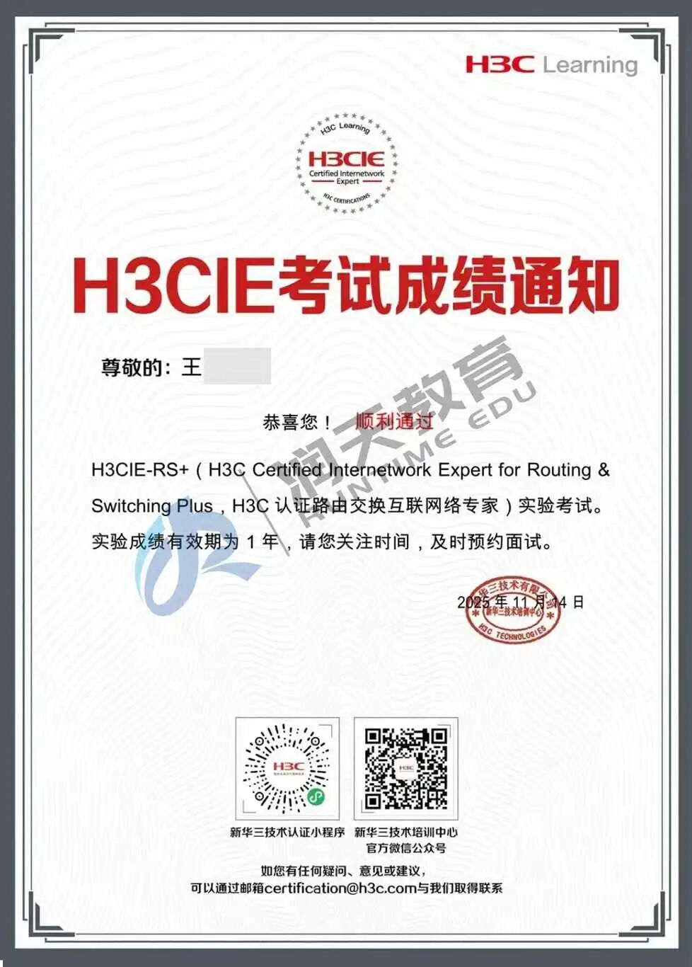 近期,我们陆续收到多位学员通过H3CIE-RS+认证的好消息——笔试稳扎稳打、机试从容应对、面试自信流畅。一张张高含金量的证书背后,不仅是学员日复一日的努力,也离不开我们对H3CIE-RS+全周期教学体系的持续打磨与优化。