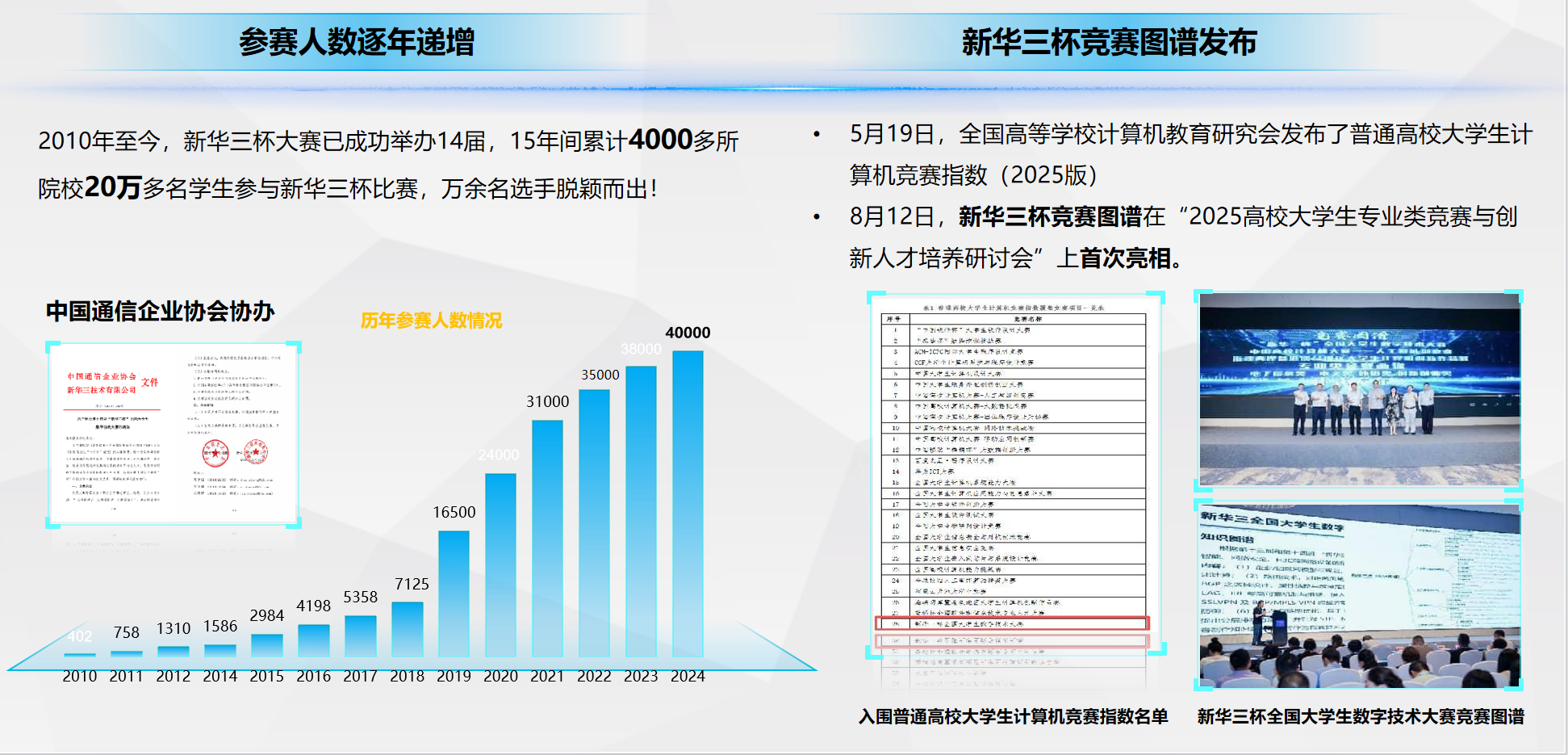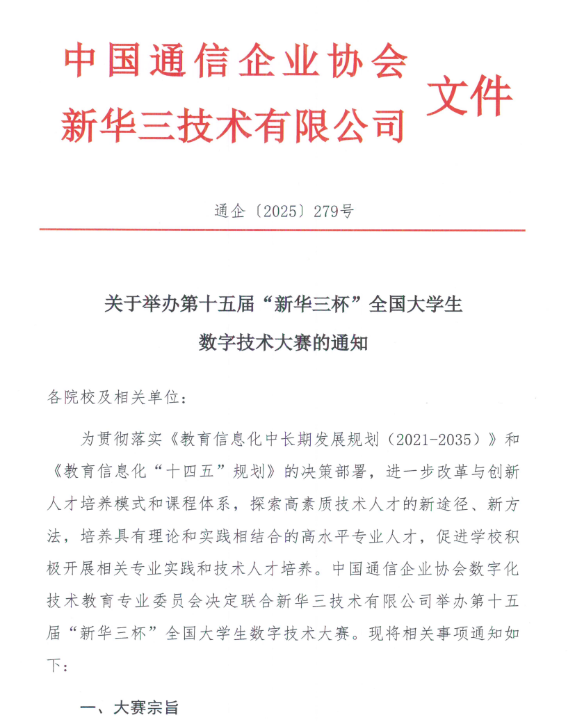 由新华三集团与中国通信企业协会联合主办的第15届“新华三杯”全国大学生数字技术大赛现已全面启动。这项连续举办14届、累计吸引全国4000多所院校近20万学子参与的赛事,已成功入选《普通高校大学生计算机竞赛指数(2025版)》,成为国内数字化人才培养的重要标杆。
