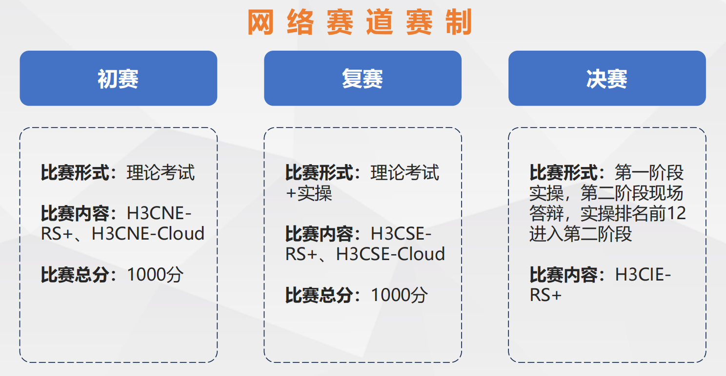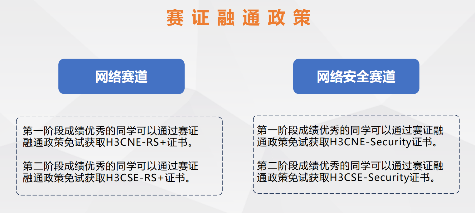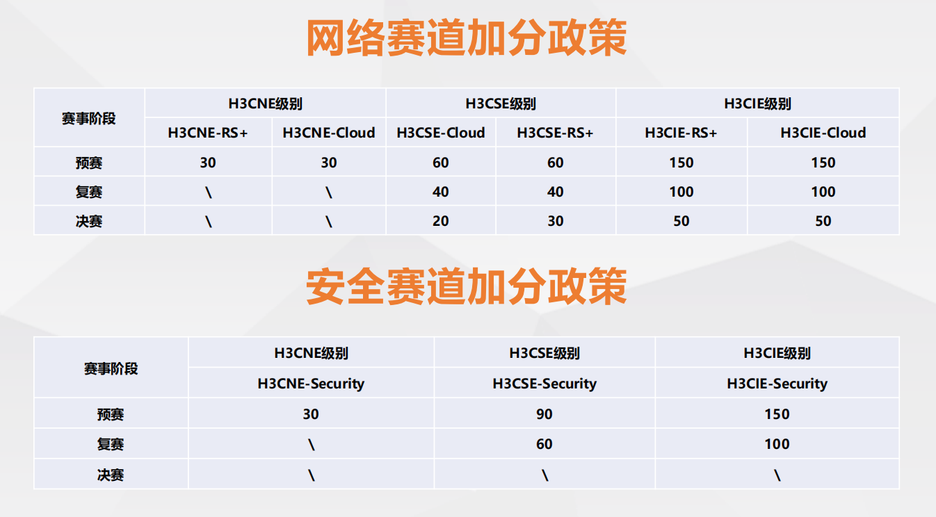证书加分:持有H3CNE/H3CSE/H3CIE等相关认证,可在对应赛段获得直接分数加成,建立领先优势。