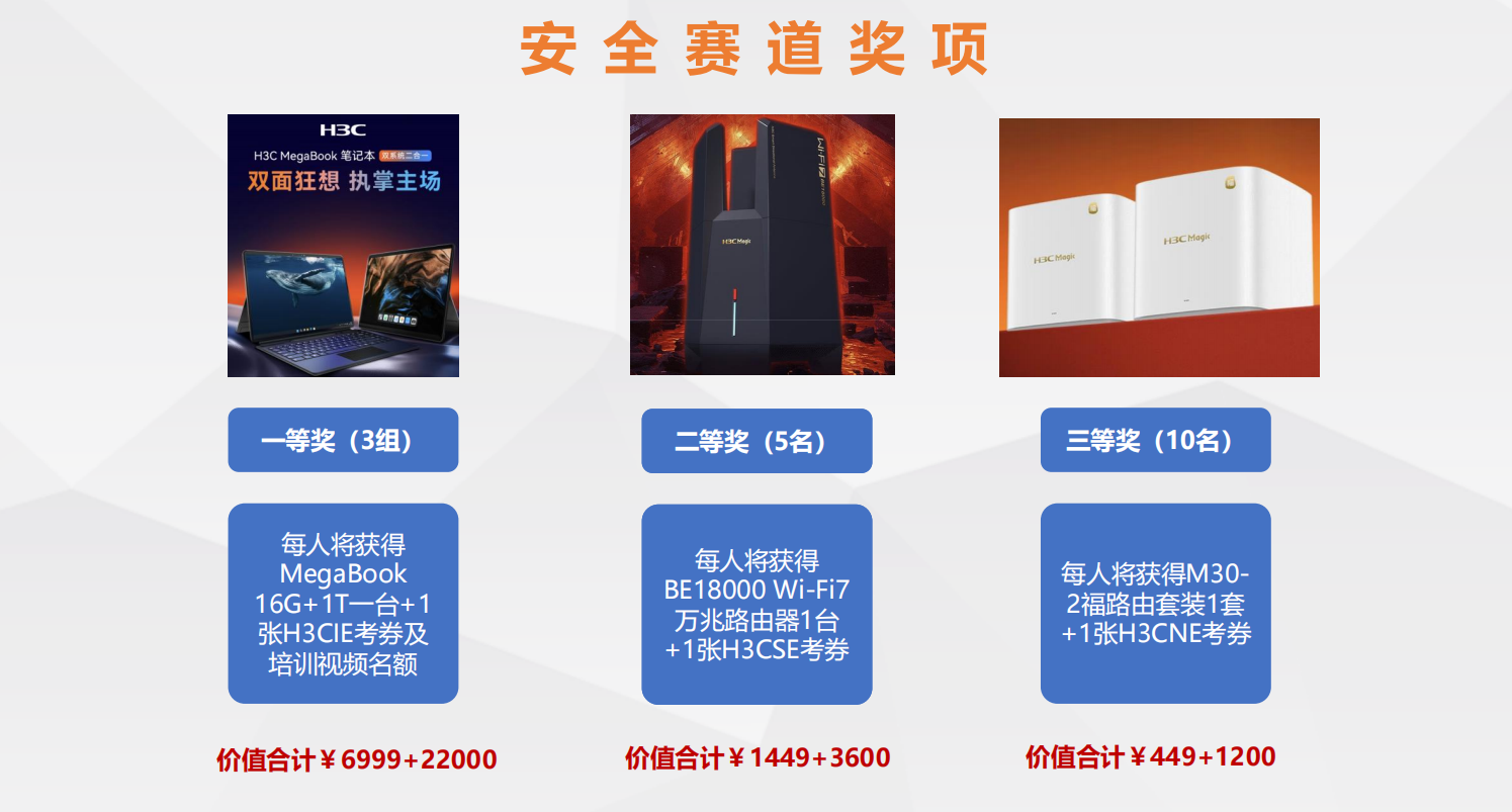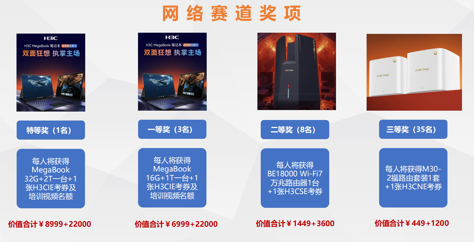 本届大赛奖品全面焕新,价值显著提升!包括但不限于H3C MegaBook顶级性能笔记本、Wi-Fi7万兆高端路由器等硬件大奖,以及H3C认证考券,助力你的职业之路快人一步。