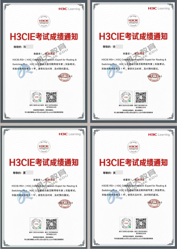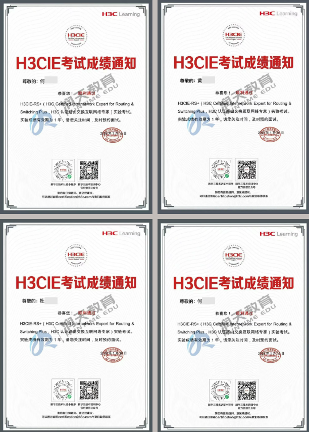 近期,我们欣喜地得知,又有多名学员成功通过了H3CIE-RS+实验考试,向最终认证迈出了扎实而关键的一步。