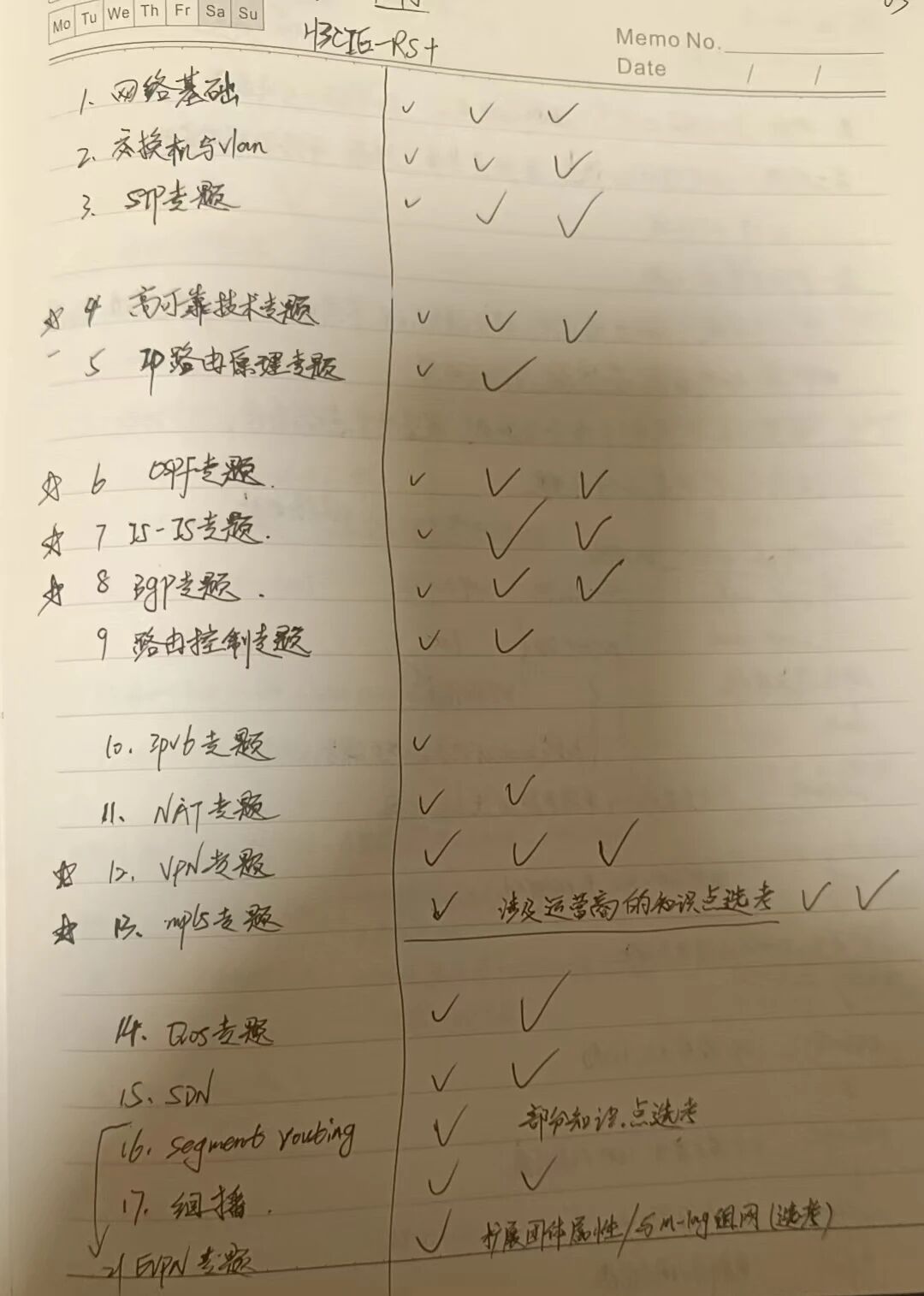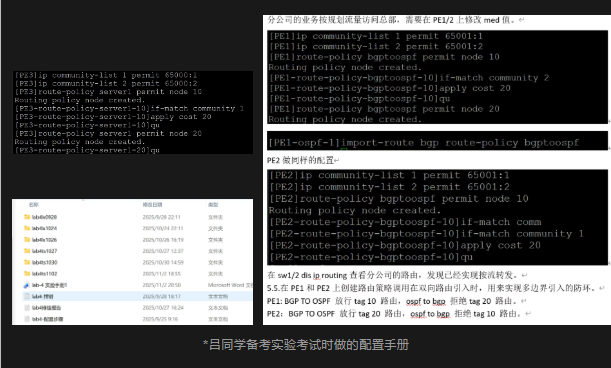 我采用了“先难后易”的策略。LAB有三个版本(1、3、4),版本4最难。我先从版本4开始,跟着邓老师的讲解视频做一遍,整理出自己的配置指导手册,然后脱离手册练习,熟练后再用排错版本巩固。版本4花了2周,版本3和1加起来用了2周。之后就是反复模拟考试环境,轮番练习各个版本,直到考前。我会定期向邓老师汇报练习情况,考前根据他的最后叮嘱,重点注意审题和细节变化。
