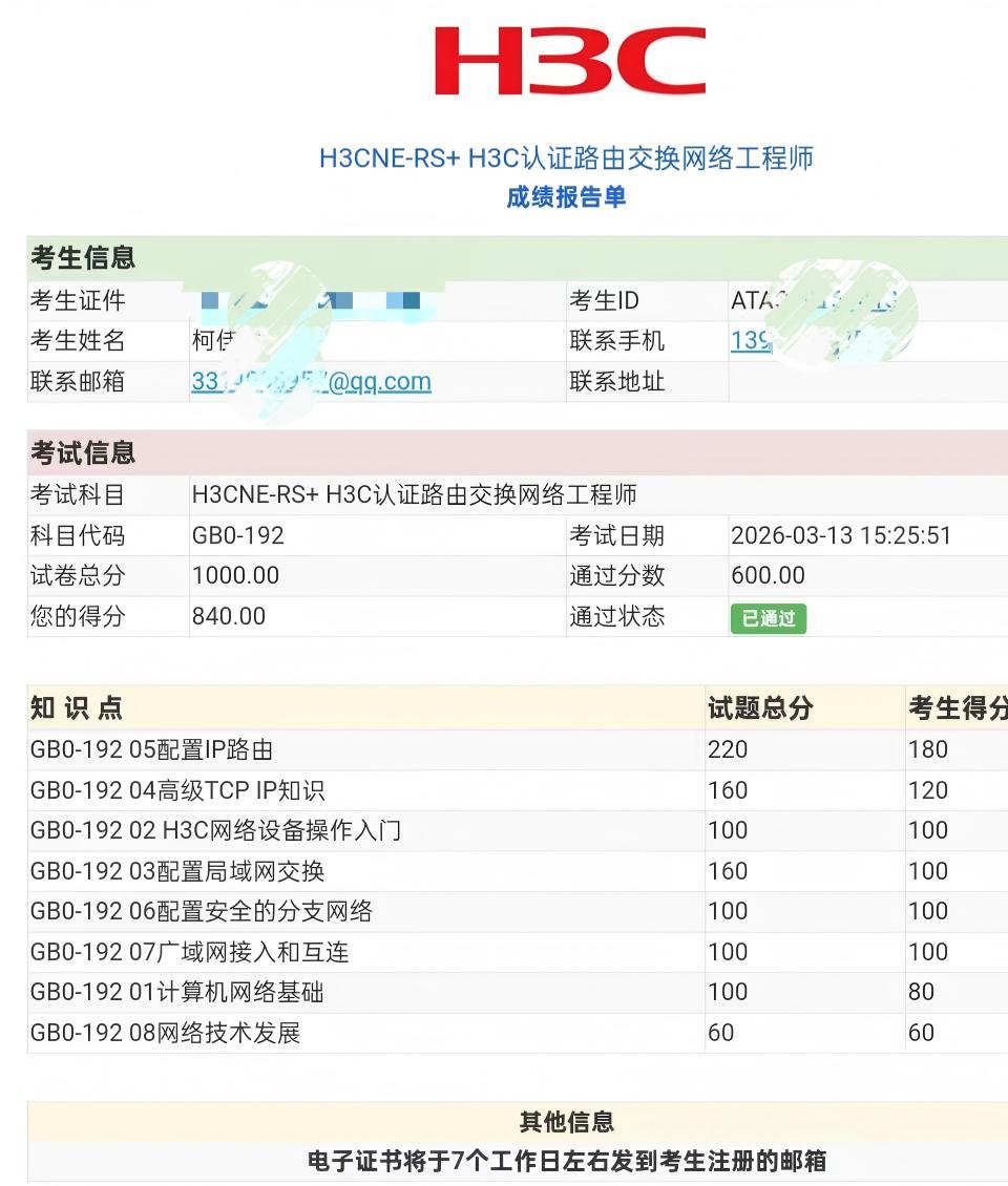 先说句实话。H3CNE-RS+(GB0-192)考试确实是客观题,题型包括单选、多选和判断。有考生分享过,只要熟背题库,保证准确率达到90%,花20天左右每天刷1-2小时题,就能顺利通过。