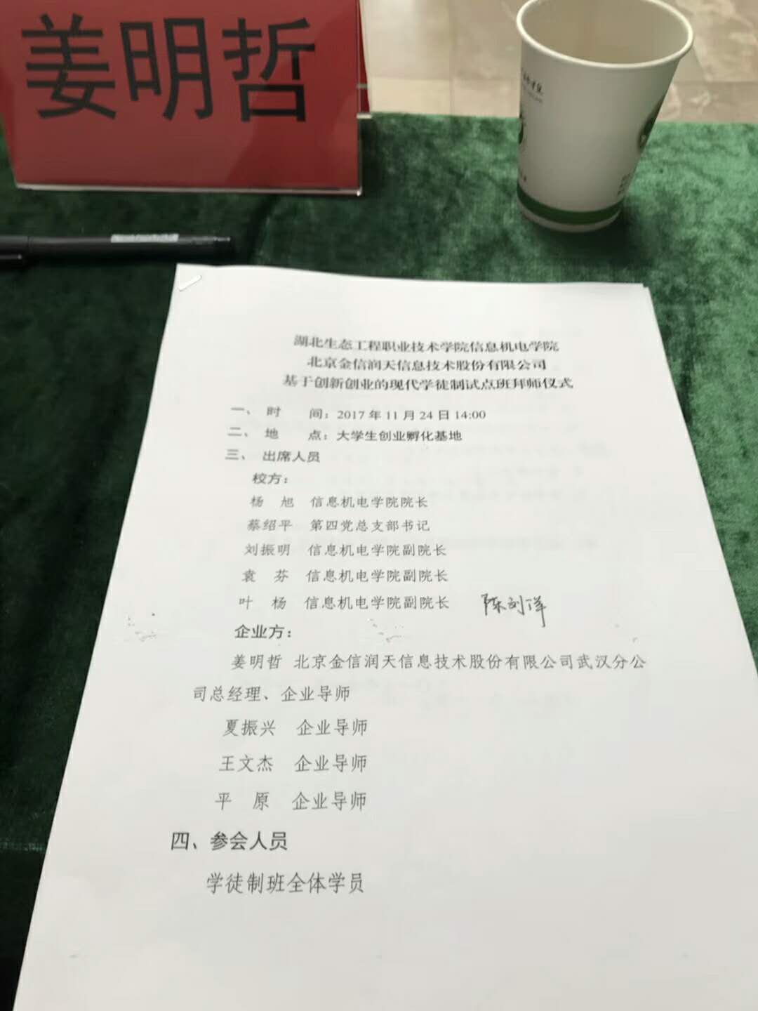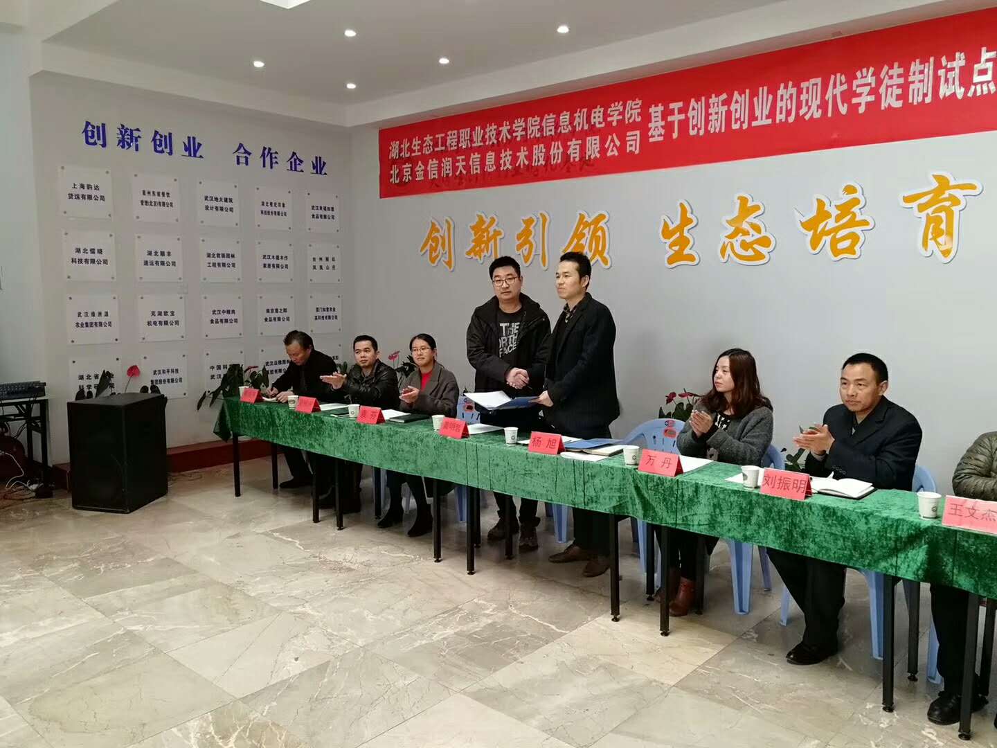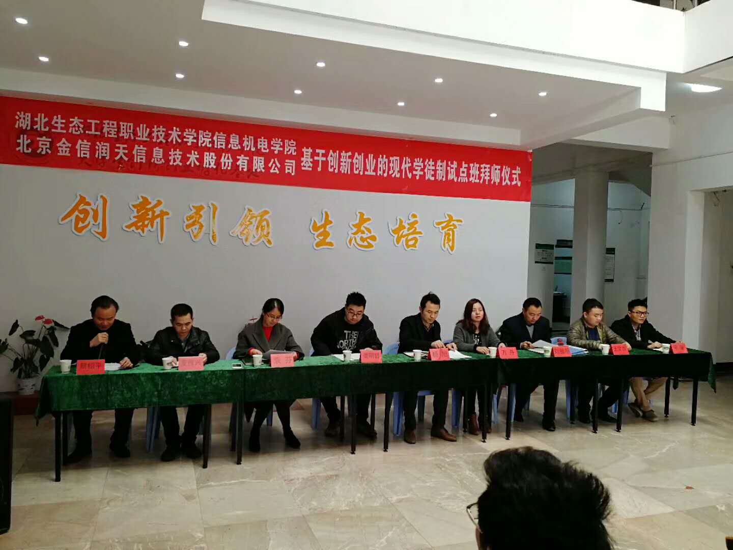 湖北生态工程职业技术学院信息机电学院&北京金信润天信息技术股份有限公司基于创新创业的现代学徒制试点班拜师仪式,校企双主体育人,学校教师与企业导师联手培养,校中学,企中训,项中练,弘扬“工匠精神”,学校、企业、社会责任重大