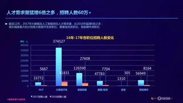 有关数据显示, 2017年前10个月内,AI人才需求量已经达到2016年的近两倍,2015年的5.3倍,人才需求直线上升年复合增长率超200%,招聘人数60万+。